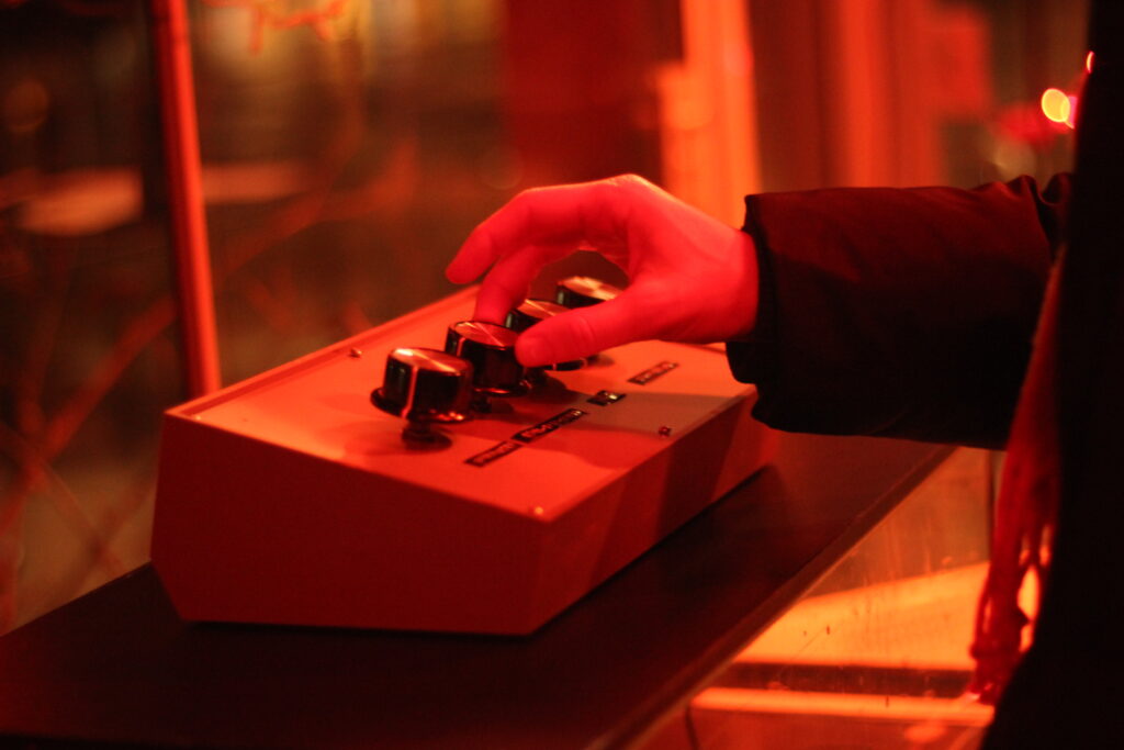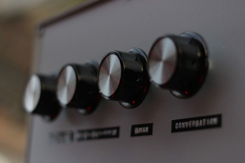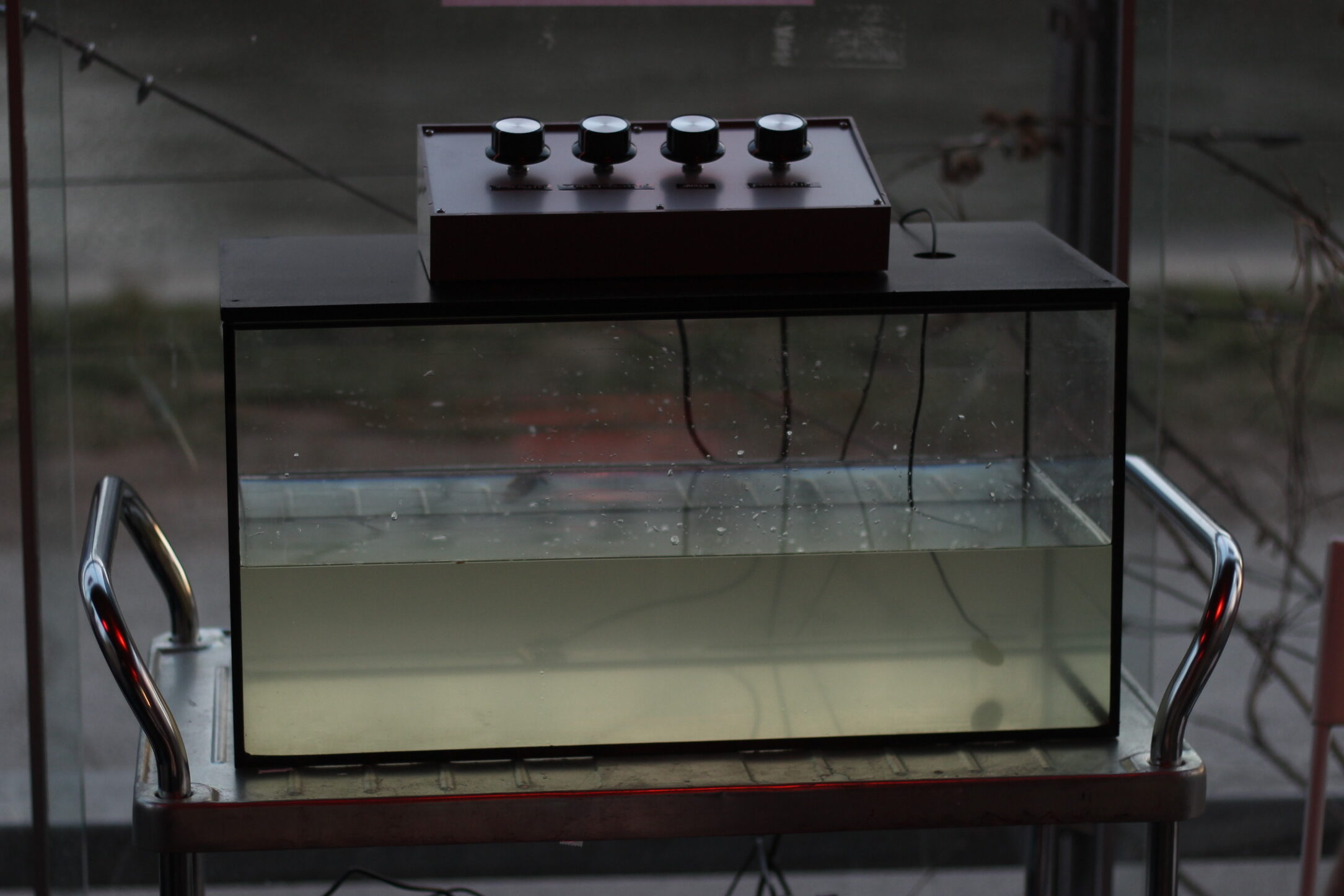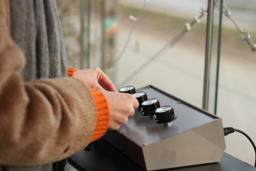 The mixing device has four rotary knobs. Each knob is assigned to a specific sound stream, which increases or decreases the volume. Whoever operates the knobs, is regulating the sounds. By choosing and regulating the channels one decides what is audible. The first knob is assigned to the water sounds of the Danube, symbolizing the steady flow of the river. Only when the first knob is turned on, the other streams play. The second knob contains other-than-human sounds, like birds, highways or boats. The third channel contains stories of people who live or work around the Danube – it is the stream of human actors. The fourth knob regulates a responsive sound generating live channel that offers the possibility of spontaneous interference (more details below). The audio device is placed on a transparent container filled with Danube water.