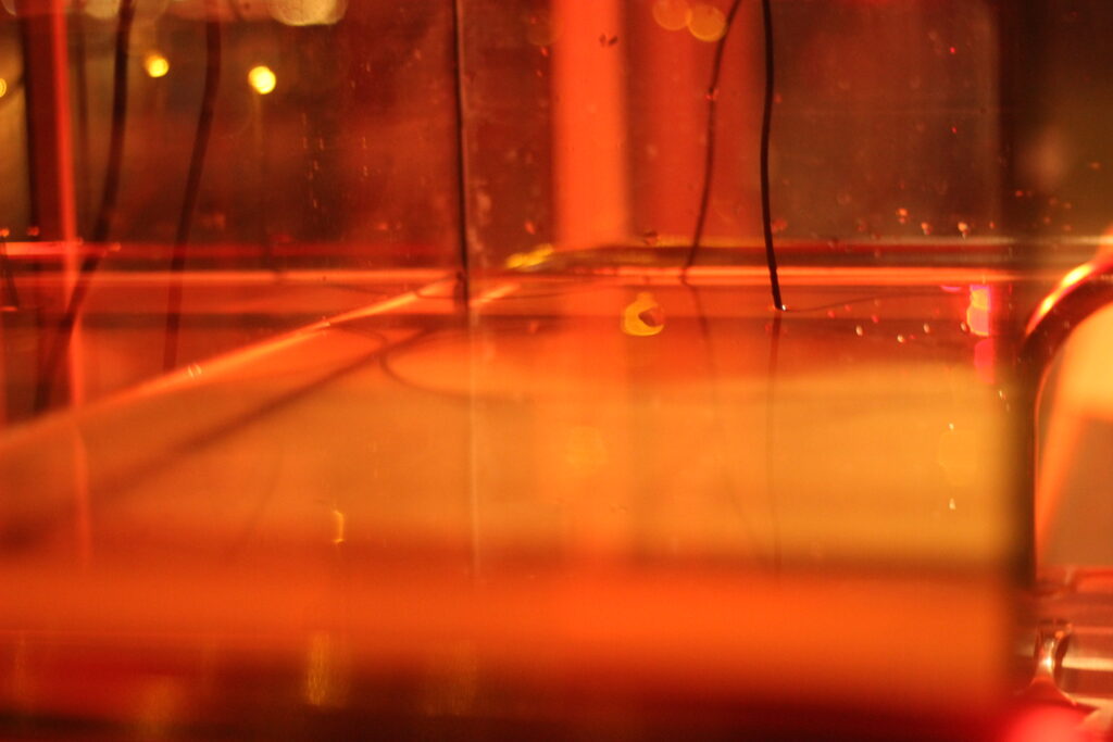 The conversation channel is fed with an external input signal (f.e. a contact microphone) which is placed in the water container. Sounds can be produced by tapping the walls. Through harder taps the water is moved and a conversation between the human and the water is initiated.